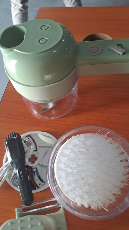 قطاعة الخضار الكهربائية 4 في 1 عبارة عن جهاز مطبخ مدمج يمكن استخدامه لتقطيع مجموعة متنوعة من المواد الغذائية، هرسها وطحنها.