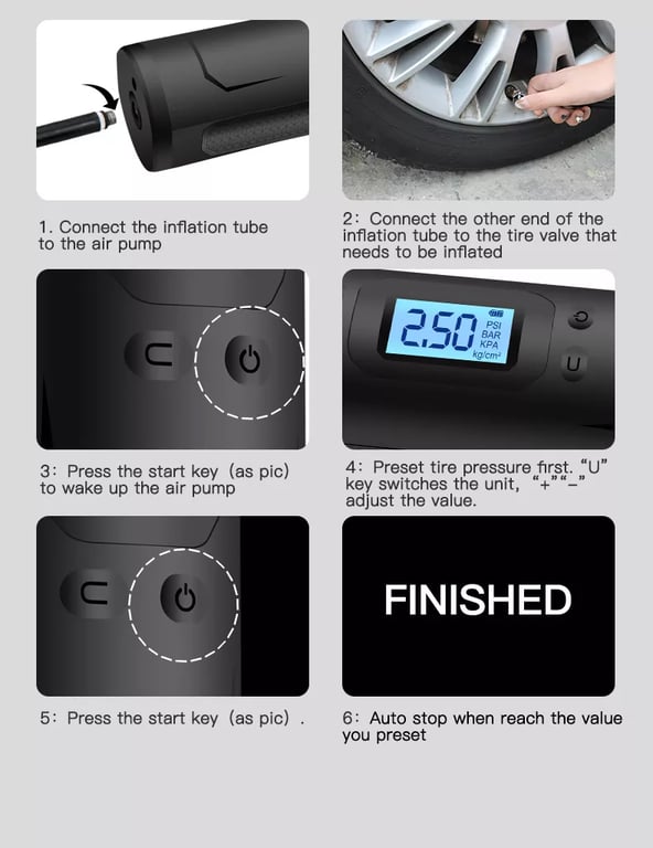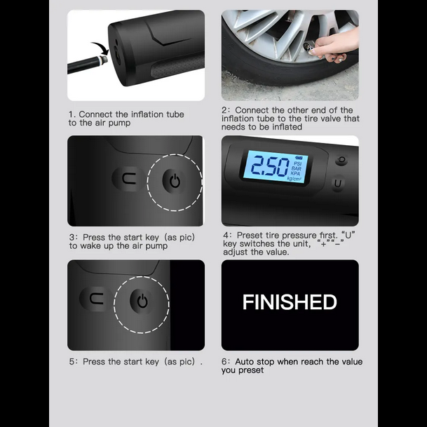 يمكن استخدام هذه المضخة في حالات الطوارئ لتعبئة إطارات السيارات، الدراجات، أو الكرات الرياضية. تصميمها أنيق ومضغوط، مما يسهل حملها واستخدامها في أي مكان.