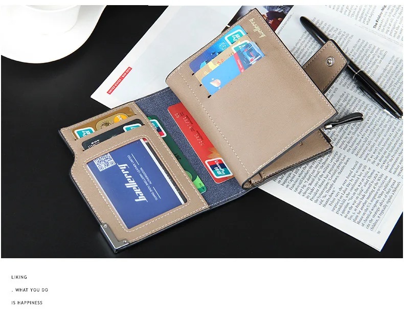 تحتوي على قسم للأوراق النقدية، وجيوب لبطاقات الائتمان، وفتحات للصور الشخصية. كما تشمل أقسام إضافية لحفظ العملات الصغيرة أو العملات المعدنية