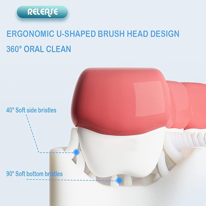 تأتي الفرشاة بشكل U، حيث يكون الجزء المرن في الأعلى يلتف حول الأسنان، مجهزة بشعيرات لتنظيف الفراغات بين الأسنان وسطح الأسنان الخارجي