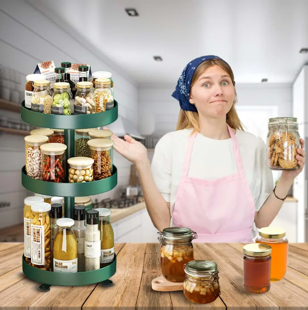منظم المطبخ الدوار هو رف تخزين دائري متعدد الطوابق، مثالي لتنظيم وعرض المكملات الغذائية والتوابل